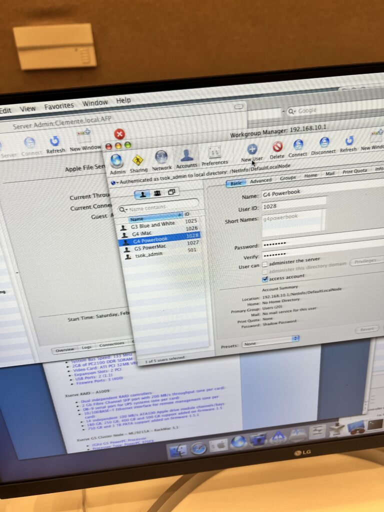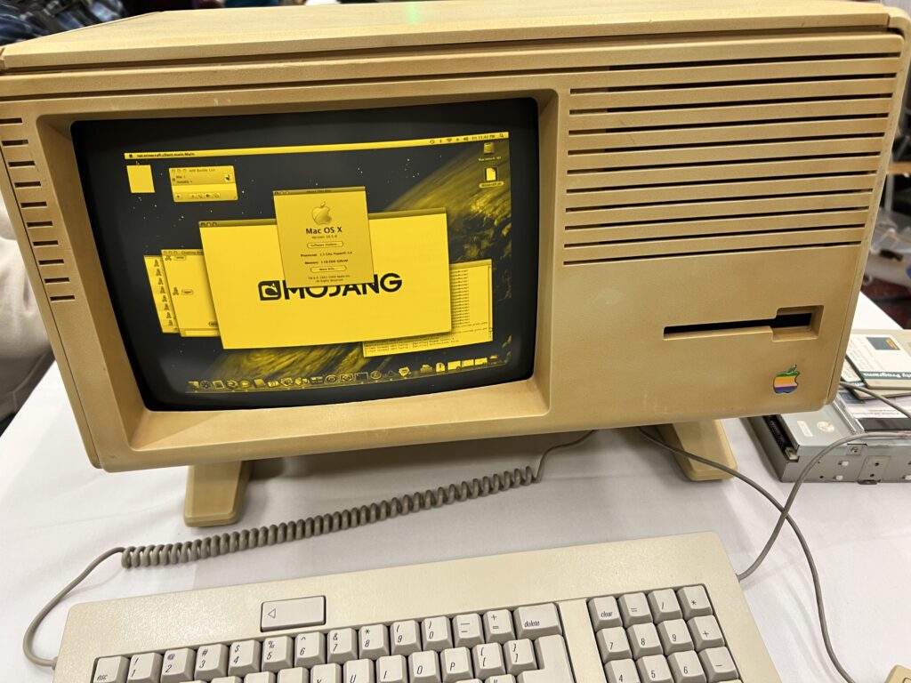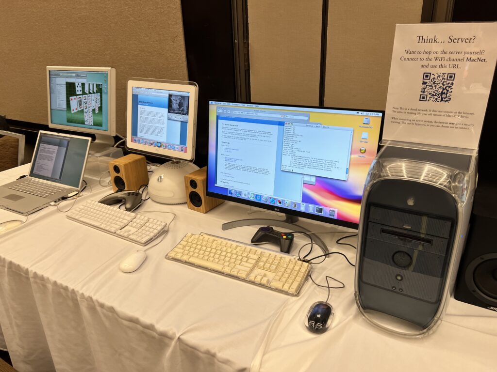 Among the other highlights, a fine fellow had a PowerPC network running, powered by a G4 XServe and a G5 Xserve (even though it had issues). He had picked up most of the equipment from a video production business that gave him an ultimatum to get rid of it. Alongside it, a bevvy of PowerPC (and one Xeon) Mac that pulled applications and data from the central raid. You could even join the local WiFi network and read fun little webpages about the period-correct setup.